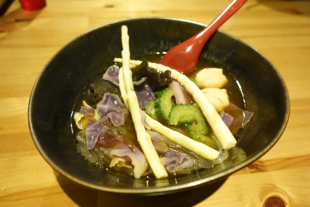 トッピング:黒きくらげ・花ビラダケ・えび団子・ゴーヤ・味玉・紫キャベツ・細竹の子
