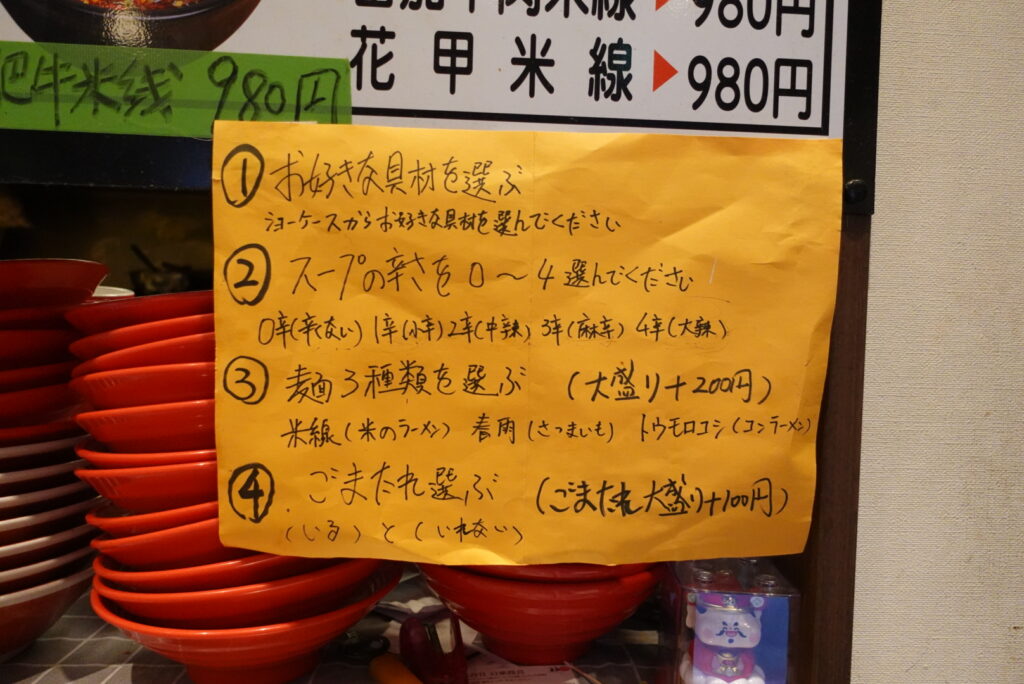 0辛(辛くない)1辛(小辛)・2辛(中辣)・3辛(麻辛)4辛(大辣)