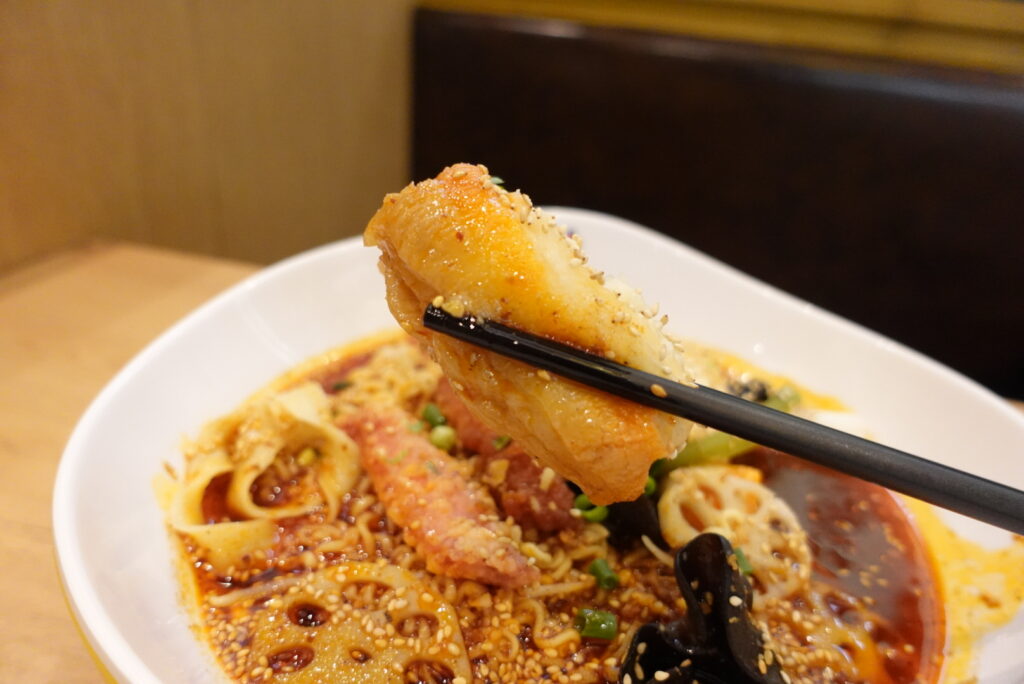 トッピング:鶏の唐揚げ・かにかまの天ぷら・揚げパン・ブンモジャ・カニ団子・センマイ・きくらげ・ちくわ・山くらげ・腐竹・蓮根・もやし・刀削麺・サリ麺