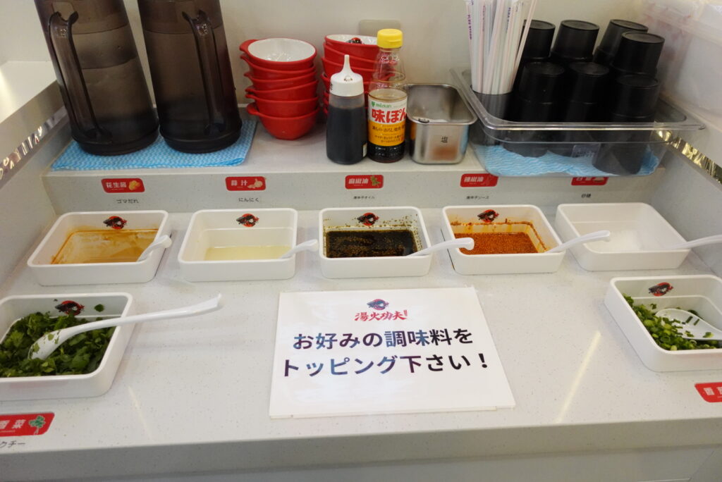 トッピング:小松菜・魚卵ボール・湯葉・たけのこ・大豆もやし・じゃがいも・豆皮・昆布・山くらげ・干し豆腐・豆苗・揚げグルテン・銀きくらげ・イカカット・もも軟骨